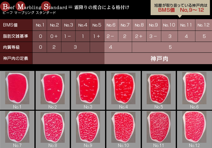 下に貼り付けてるのは神戸牛の格付け表なので、私が見たのとは若干違いますが、ほぼ同じようなものです。