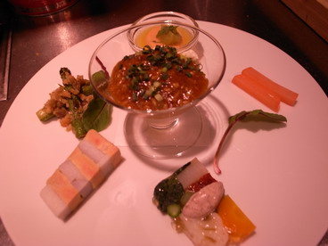 真ん中は冷製麻婆豆腐で、後はトマトのババロア、野菜テリーヌ、里芋とフォアグラのプレッセ、