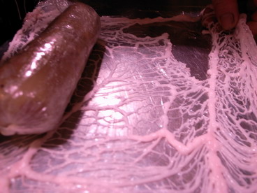 フレンチのメニューで「~のクレピネット包み」とかいてあるのはこの網みたいな脂をつかってますよーってことです。