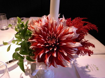 テーブルセッティングはこんな感じです。お花はかわいいお嫁さんが下の花瓶をつくり、お嫁さんの幼なじみの女の子がお花を担当、2人でつくったものです。