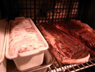 蝦夷鹿のロース肉を熟成させている写真と、今日仕込んだ蝦夷鹿のパテの写真。