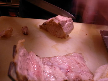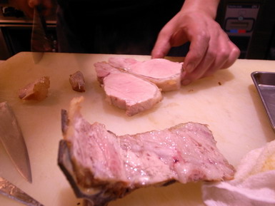 写真は600gの高座豚のロース肉を骨付きで焼いたものを、骨をはずして盛り付けの一歩手前のタイミングの写真です