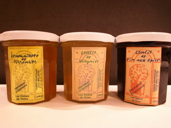 ヴィオニエ(白ブドウ)のコンフィチュール、シラー(赤ブドウ)とエピスのコンフィチュール、たんぽぽのコンフィチュールです。